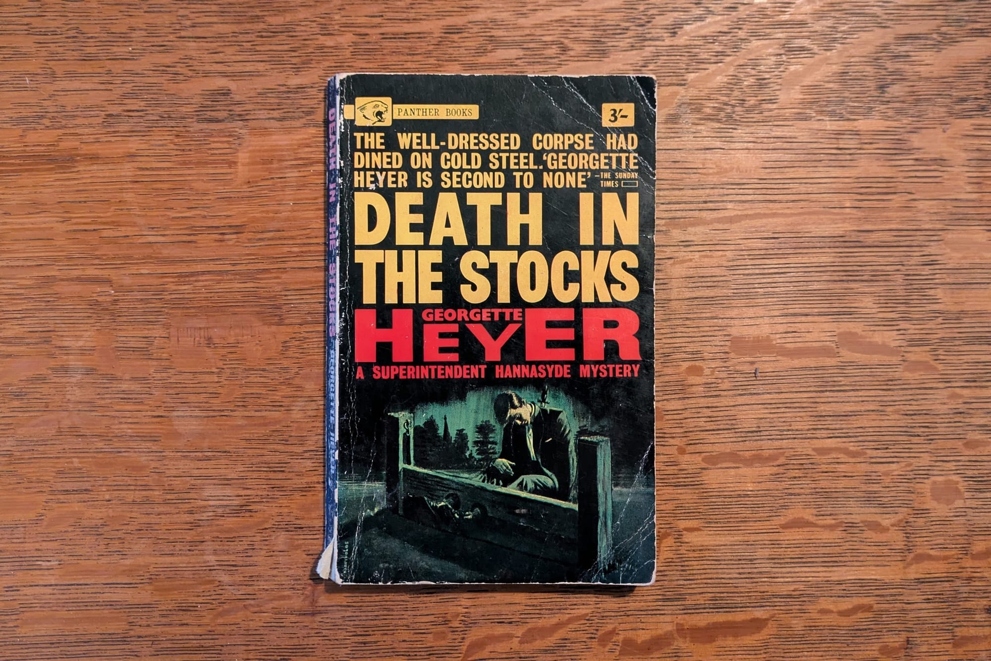 Another superb setup for her 1935 effort: a corpse clad in evening dress is found locked in the stocks on a village green. Superintendent Hanasyde of Scotland Yard β who would become one of Heyer's two recurring detectives β is called in to investigate. He spends much of the book sparring amusingly with the dead man's half-siblings, Kenneth and Antonia Vereker, who resolutely refuse to cooperate with the police like a good murder mystery subject should. This book also introduces solicitor Giles Carrington, who then recurs in the next novel.